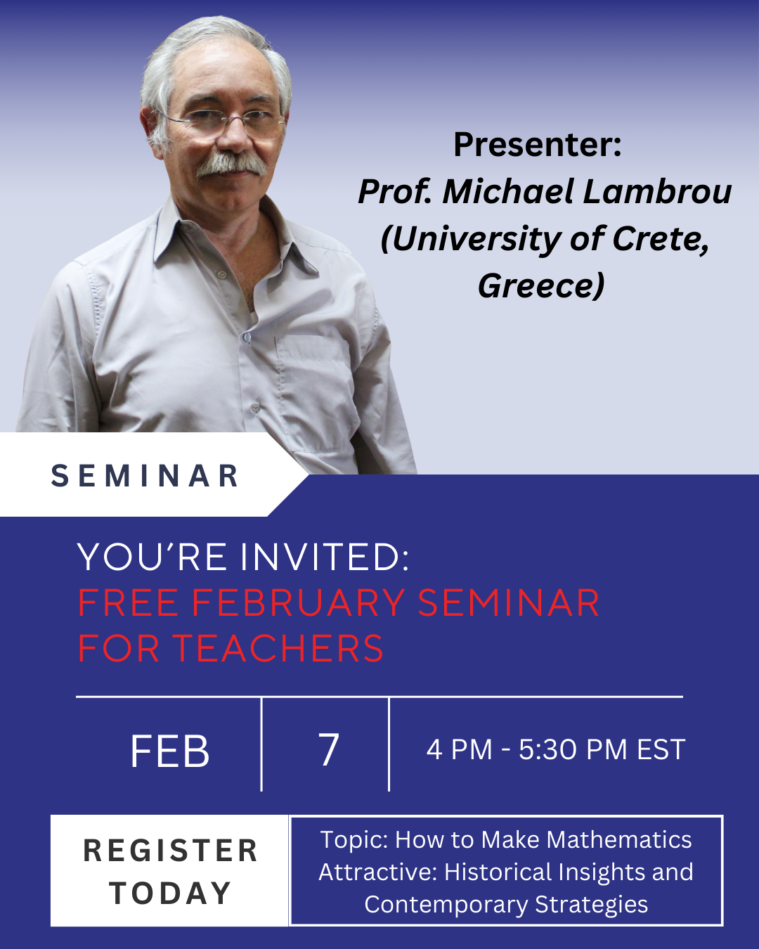 Description: This lecture explores how mathematics can be made more engaging by combining historical perspectives with practical, classroom-ready strategies. Drawing on Plato’s view that mathematics should be taught “playfully and pleasurably” while fostering creative and independent thinking, the session addresses the modern challenge of students often finding math uninviting. Through examples from Recreational Mathematics, Professor Lambrou will present clever, accessible problems that complement the standard curriculum, capture students’ attention, stimulate curiosity, and encourage creative engagement. Participants will leave with ideas for making mathematics both enjoyable and intellectually stimulating.